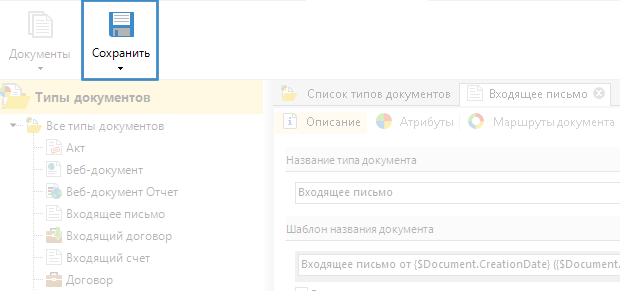 Рис. 1. Кнопка "Сохранить" на панели инструментов карточки типа документа