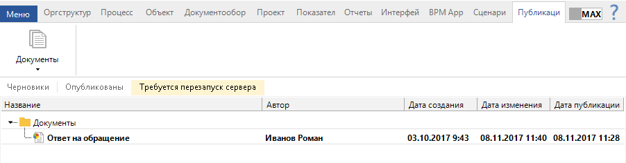 Требуется перезапуск сервера - количество элементов документооборота, которые были сохранены и опубликованы, но для них не было перезапуска сервера, и, следовательно, изменения в них недоступны в веб-приложении.