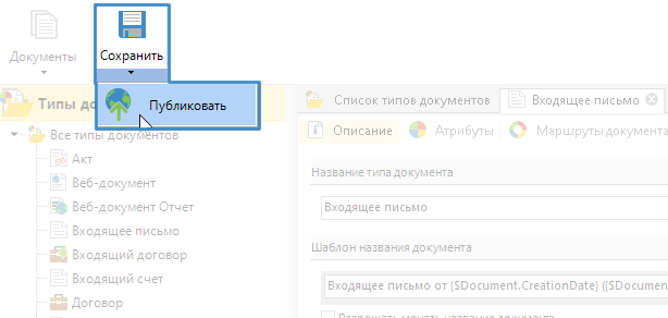 Рис. 2. Кнопка "Публиковать" на панели инструментов карточки типа документа
