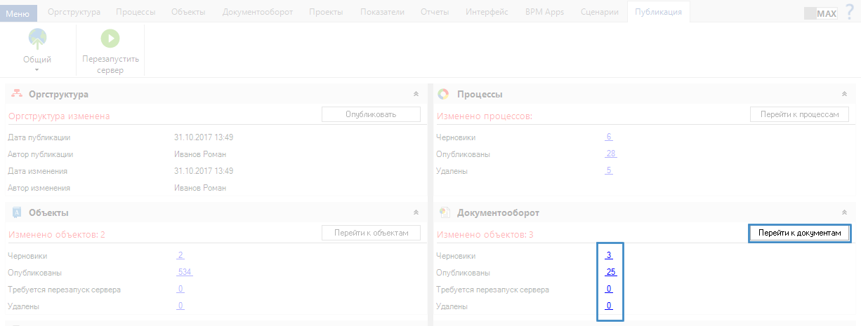 Опубликованы - количество измененных, сохраненных и опубликованных объектов.