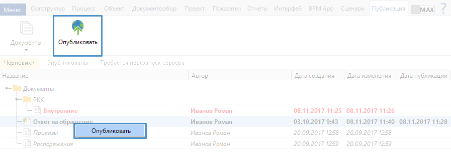 Так же опубликовать тип документа или РКК можно на вкладке Черновики раздела Документы.