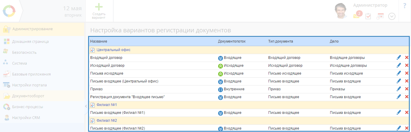 Рис.1. Раздел "Администрирование - Документооборот - Варианты регистрации документов"