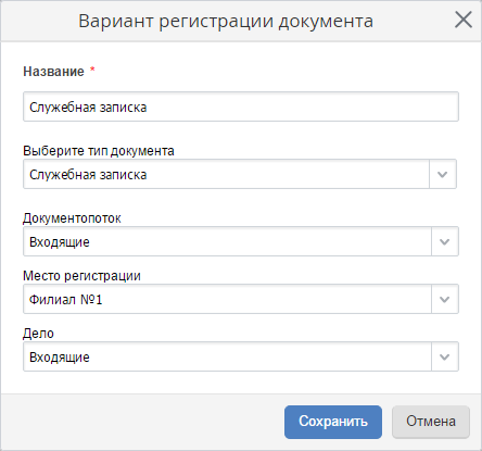Варианты регистрации документов создаются в разделе Администрирование - Документооборот - Варианты регистрации документов(рис. 1).