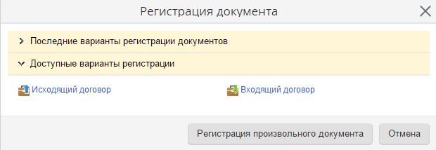 Если использование варианта регистрации не требуется, следует нажать кнопку Регистрация произвольного документа - будет осуществлен переход к заполнению параметров регистрации вручную.
