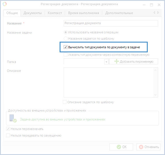 Рис 2. Карточка операции "Регистрация документа". Вкладка "Общие". Флажок "Вычислить тип документа по документу в задаче"
