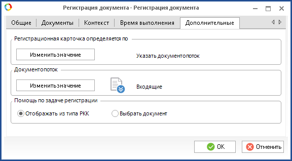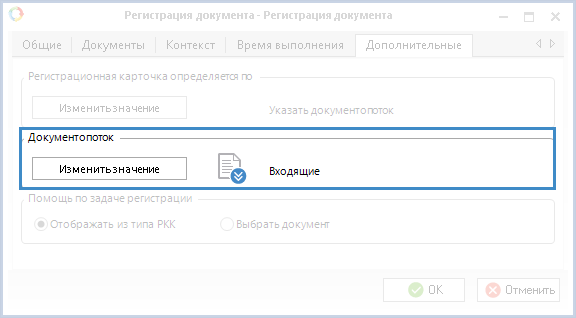 При выборе данного пункта на вкладке Дополнительные необходимо указать документопоток, РКК которого будет открыта при выполнении задачи регистрации. Для этого необходимо нажать на кнопку Изменить значение в блоке Документопоток (рис. 5).