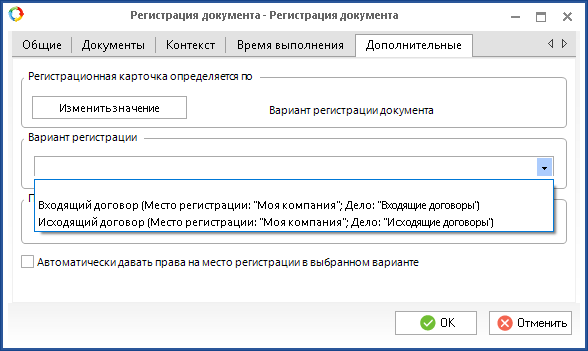 Автоматически давать права на место регистрации в выбранном варианте - если у пользователя, которому назначена данная задача регистрации, нет прав доступа к месту регистрации в выбранном выше варианте регистрации документа, при установленном здесь флаге доступ к этому месту регистрации назначится автоматически. Данный параметр отображается только в случае, если в блоке Регистрационная карточка определяется по указано значение Вариант регистрации документа.