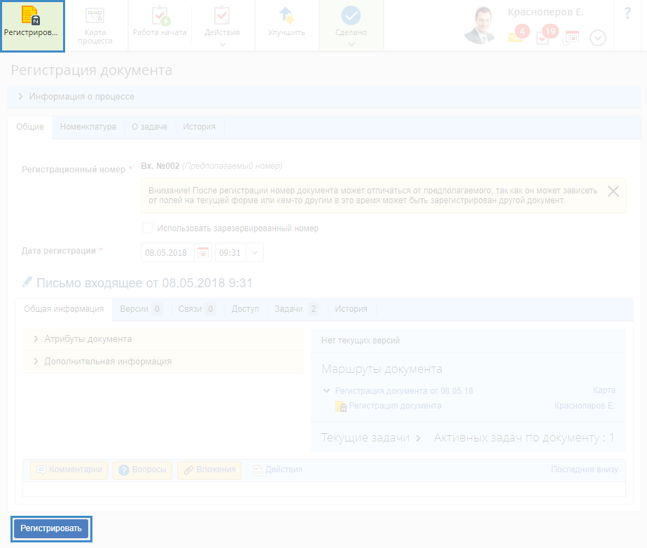 Данная операция создает в веб-приложении задачу регистрации документа. Исполнители данной задачи определяются исходя из зоны ответственности в которой находится данная операция.