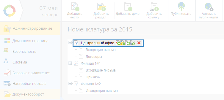Рис.3. Меню действий с местами регистрации и разделами