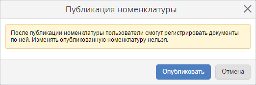 В случае если номенклатура является сквозной, т.е. создана на неограниченное количество времени, после нажатия кнопки Публиковать будет отображено окно с информацией (рис. 2). Для публикации номенклатуры необходимо нажать на кнопку Опубликовать.
