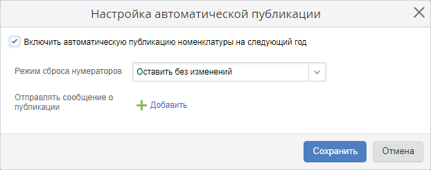После сохранения настроек номенклатура будет автоматически переноситься на следующий год до момента отмены автоматической публикации.