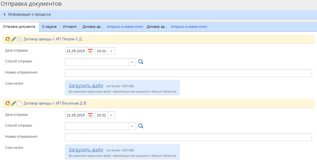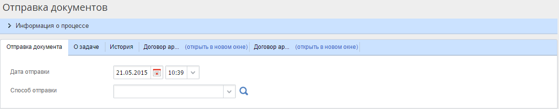 Задача отправки документов назначается исполнителю зоны ответственности, в которой находится операция Отправка документа. Данная задача позволяет организовать контроль отправки документов. Пример задачи отправки документа представлен на рис. 5.