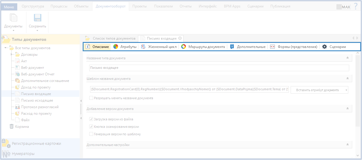 Жизненный цикл. Данная вкладка отображается только в том случае, если в карточке типа документа на вкладке Описаниеустановлен флажок Использовать жизненный цикл для документов этого типа. Подробнее о данной настройке см. соответствующую страницу справки.