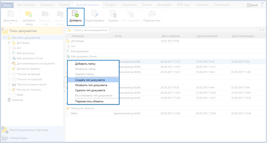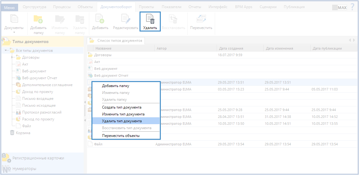 В системе ELMA предусмотрены следующие действия с типами документов: