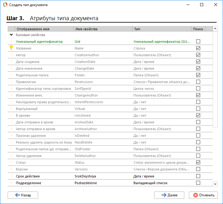 Синим цветом выделены атрибуты, унаследованные от базового типа документа. Данные атрибуты нельзя удалять или редактировать.