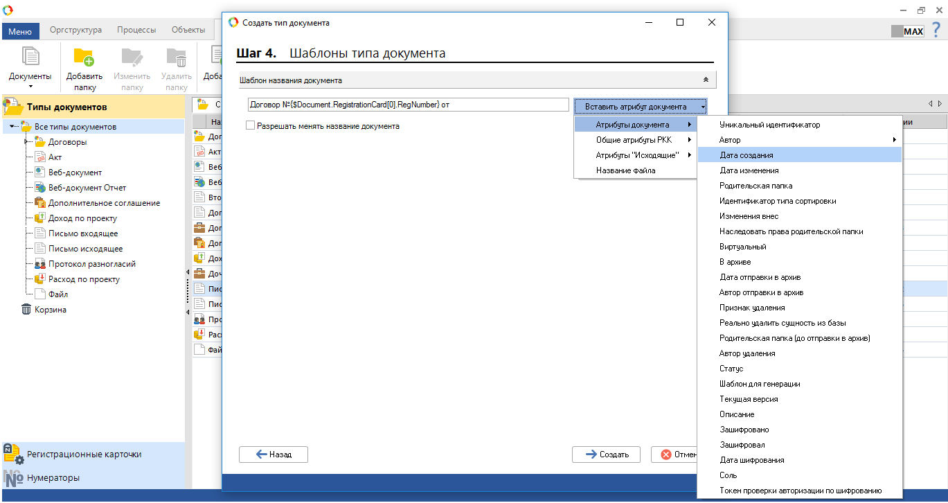 На данном шаге определяется шаблон формирования названия документа данного типа. Для формирования названия можно использовать атрибуты типа документа (рис. 4).