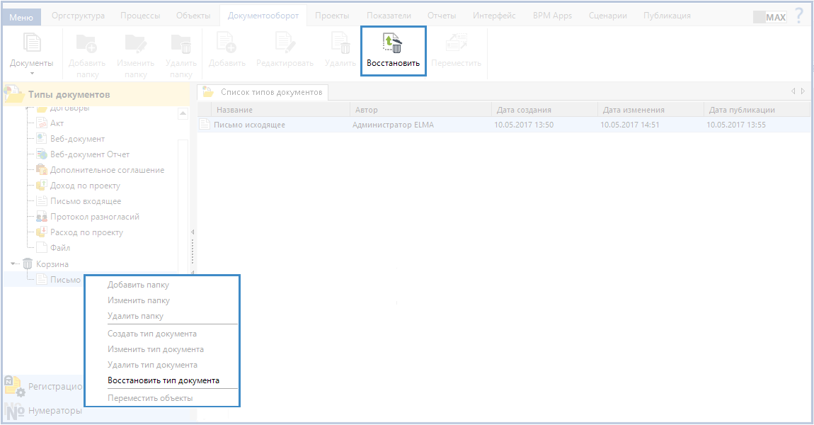 выбрать тип документа в дереве типов документов и воспользоваться кнопкой Восстановить, расположенной на верхней панели инструментов;