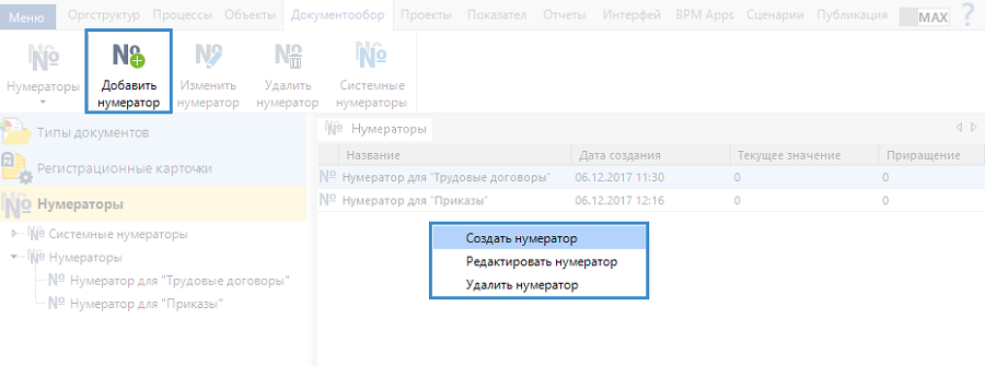 нажать на кнопку Создать нумератор, расположенную в контекстном меню (рис. 2).
