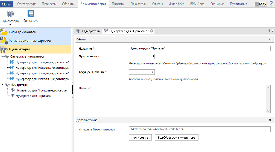 В дизайнере ELMA можно редактировать как системные, так и пользовательские нумераторы.
