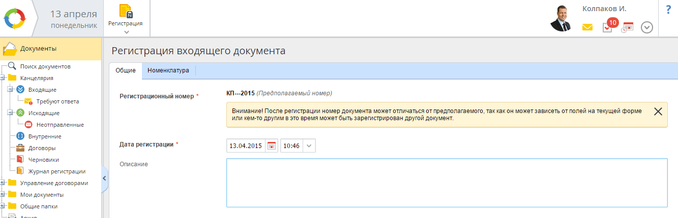 После завершения регистрации, документ будет отображаться в одной из папок-фильтров раздела Канцелярия в соответствии с выбранными параметрами регистрации.