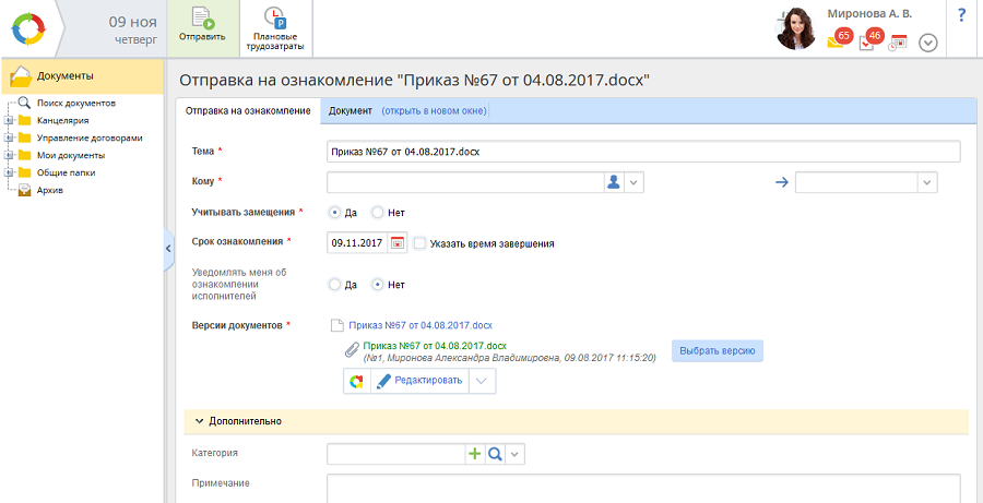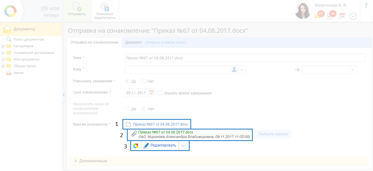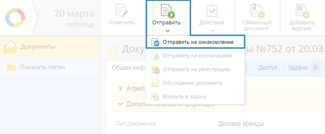 Для того, чтобы отправить документ на ознакомление, необходимо: