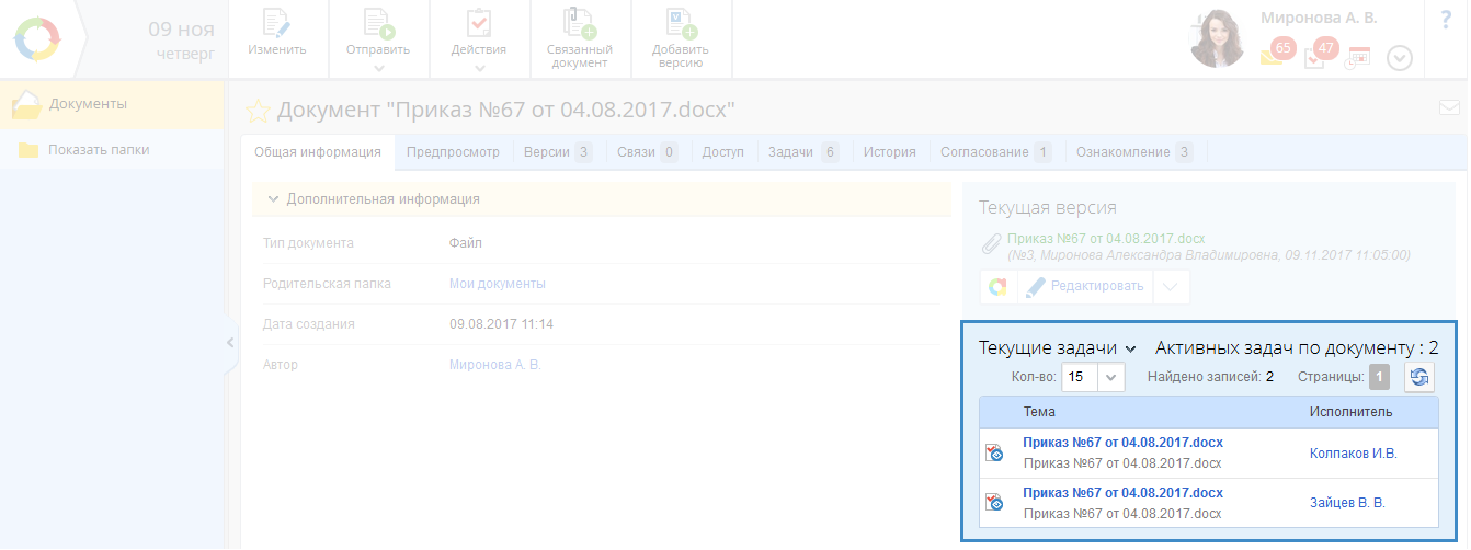 3. В карточке документа на вкладке Общая информация в разделе "Текущие задачи" отображаются текущие задачи ознакомления с документом для всех пользователей, которым он был отправлен на ознакомление (рис. 8).