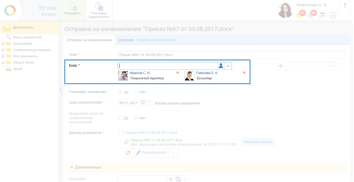 Форма отправки на ознакомление содержит две вкладки: Отправка на ознакомление и Документ.