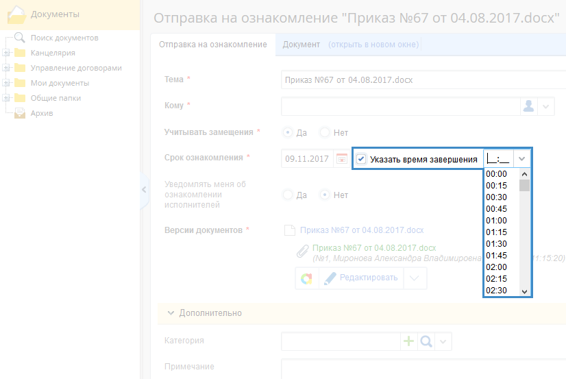 . При необходимости можно установить не только дату, но и время, до которого выбранные пользователи должны ознакомиться с документом. Для этого необходимо установить флажок Указать время завершения (рис. 5) и выбрать время в формате ЧЧ:ММ или из выпадающего списка. Поле обязательно для заполнения.