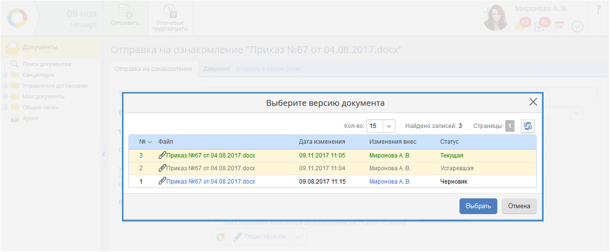 Версии документов * – позволяет выбрать версию документа, которую необходимо отправить на ознакомление, если документ имеет несколько версий. По умолчанию отображается текущая версия документа. Для изменения версии нажмите на кнопку Выбрать версию и из открывшегося списка выберите нужную версию документа. (рис. 6). Выбрать можно только одну версию документа.