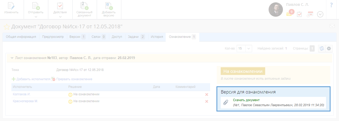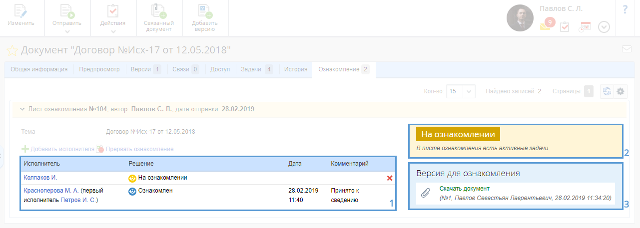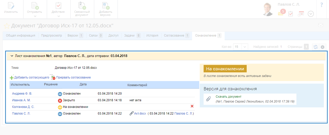 При отправке документа на ознакомление создается новый лист ознакомления, в котором отражены все пользователи, которым был отправлен документ на ознакомление, и результаты ознакомления (ознакомлен/на ознакомлении/ознакомление прервано).