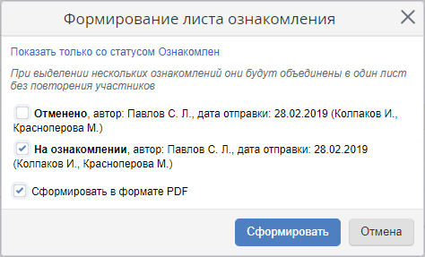 При выборе нескольких листов ознакомления, в файле экспорта они объединяются в один лист без повторения участников. Статусы ознакомления, даты и комментарии подставляются из последнего листа ознакомления для каждого пользователя. В системе листы ознакомления не объединяются.