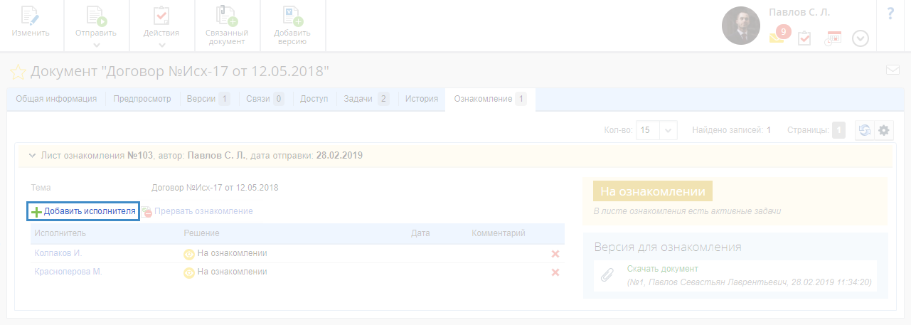 Рис. 3. Кнопка добавления исполнителя в лист ознакомления