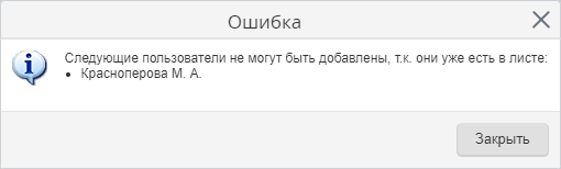 определённых настройках система не позволит выбрать пользователей, уже указанных в листе ознакомления. В таком случае отобразится сообщение об ошибке (рис. 4).