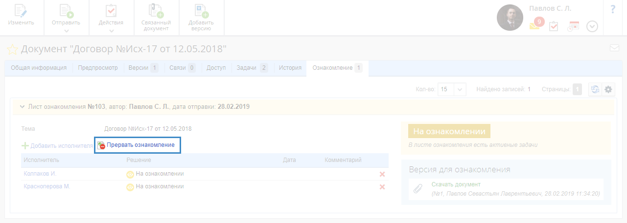 2. Прервать ознакомление. Ознакомление прерывается сразу для всех пользователей из текущего листа ознакомления.