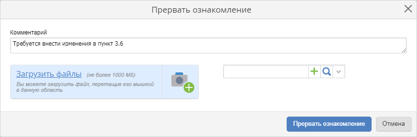 На открывшейся форме подтвердите прерывание нажатием кнопки Прервать ознакомление или отмените прерывание нажатием кнопки Отмена (рис. 6). Также имеется возможность указать при этом комментарий в соответствующем поле и/или прикрепить файл.
