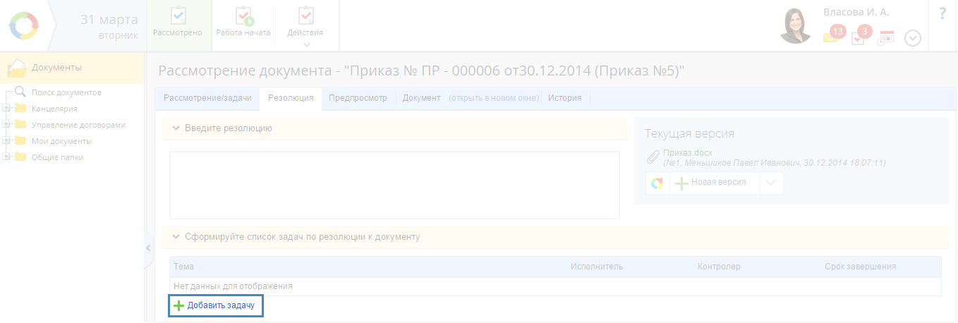 Для того чтобы добавить новую задачу по резолюции, воспользуйтесь кнопкой Добавить задачу на вкладке Резолюция (рис.5).