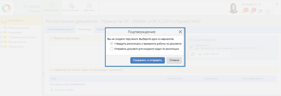Утвердить резолюцию и прекратить работы по документу – завершить задачу рассмотрения, не создавая задач по резолюции.