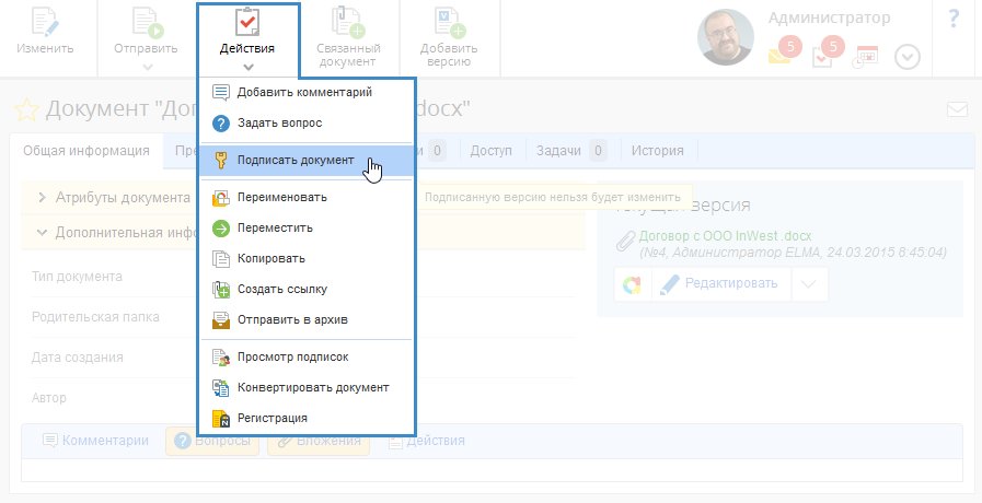 Рис. 2. Контекстное меню версии документа. Кнопка "Подписать"