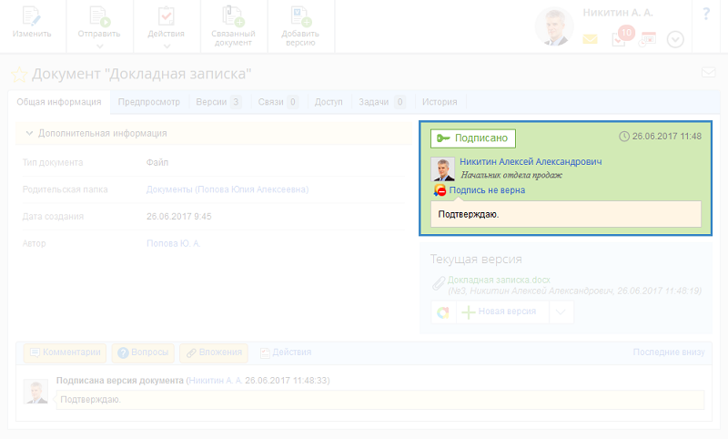 В случае, если версия документа будет отредактирована и сохранена в корневом файле, расположенном в директории ..\Общая папка с файлами системы\ELMA\UserConfig\Files, то на карточке документа будет отображена надпись Подпись не верна (рис. 8).