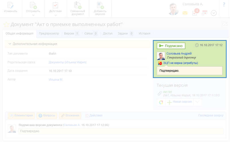 В случае, если версия документа будет отредактирована и сохранена в корневом файле, расположенном в директории ..\Общая папка с файлами системы\ELMA\UserConfig\Files, то на карточке документа будет отображена надпись ЭЦП не верна (атрибуты) (рис. 9).