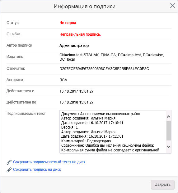 В нижней части диалогового окна Информация о подписи расположены ссылки для скачивания подписи и подписанного текста документа. В случае использования внешнего криптопровайдера и установки флажка Подписать содержимое с помощью ЭЦП (рис. 5) в данном диалоговом окне (рис. 8) появится ссылка для скачивания подписанного документа. Данная возможность позволяет сохранить и отправить скаченные файлы на проверку подлинности ЭЦП.