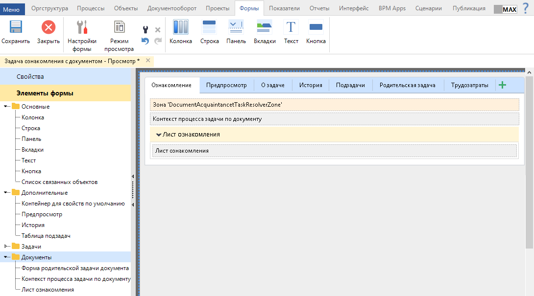 При редактировании формы задачи ознакомления с документом в блоке Элементы формы также отображается группа Документы. Отличие заключается в наличие элемента Лист ознакомления вместо элемента Лист согласования. По умолчанию данный элемент расположен на вкладке Ознакомление. В веб-приложении данный элемент обеспечивает отображение текущего листа ознакомления.