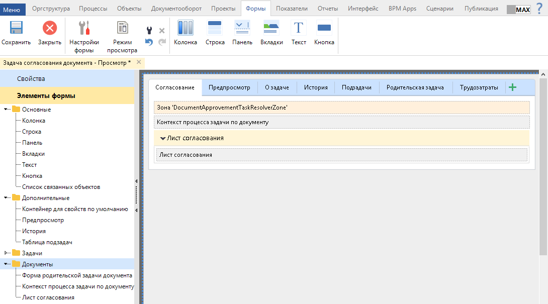 Рис. 2. Дизайнер ELMA. Форма задачи согласования документа. Группа "Документы" и элемент "Предпросмотр"