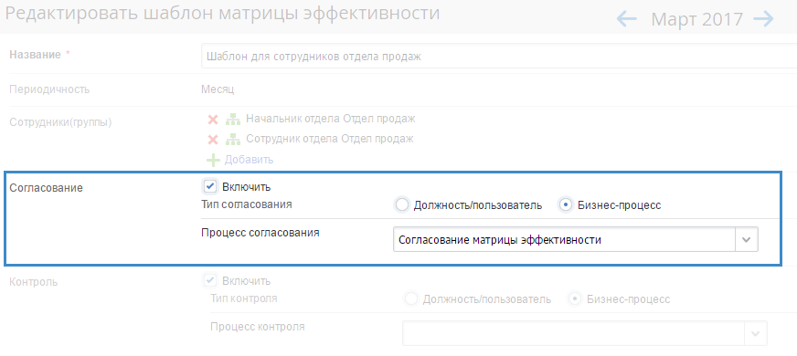 Настройки использования процесса контроля матрицы эффективности аналогичны настройкам использования процесса согласования матрицы эффективности, но выполняются в блоке Контроль.