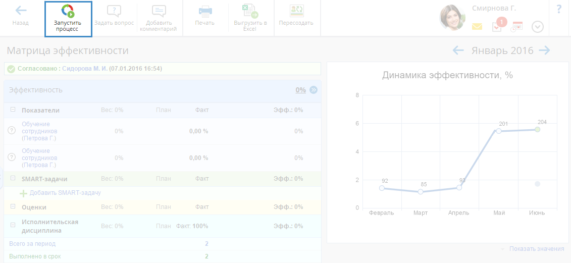 Механизм согласования/контроля матрицы эффективности одним пользователем реализован в веб-приложении на странице соответствующей матрицы эффективности. Подробнее о данных механизмах см. соответствующие страницы справки.