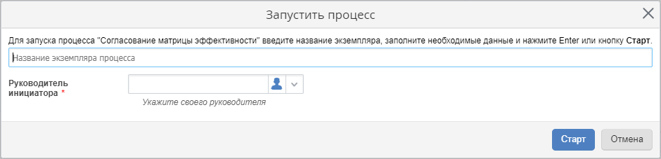 При необходимости следует заполнить все требуемые поля и нажать на кнопку Старт. В случае, если для процесса предусмотрен шаблон наименования экземпляра процесса, поле с названием экземпляра процесса будет скрыто, изменить значение в нем будет невозможно.