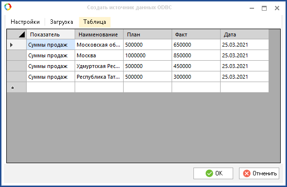 Данные из источника ODBC отображены на вкладке Таблица, представленной на рис. 5.
