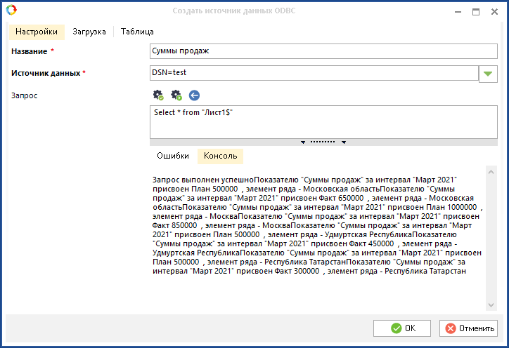 Рис. 6. Карточка источника данных OBDC. Вкладка "Настройки". Поле "Консоль". Информация об успешном выполнении запроса