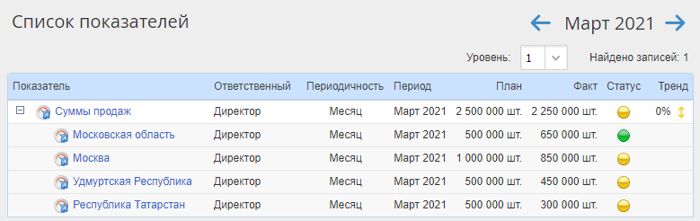 В системе ELMA необходимо создать рядовой показатель, например, Суммы продаж. Данный показатель отражает сумму продаж разных филиалов за 1 день.