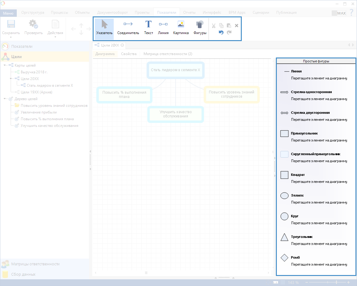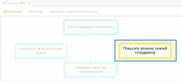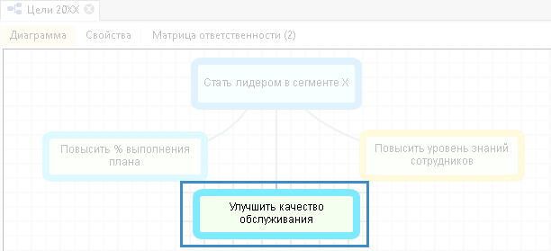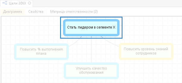 Диаграмма карты целей содержит визуализированную информацию обо всех целях и группах целей (в виде связанных между собой блоков в пределах выбранной карты целей).